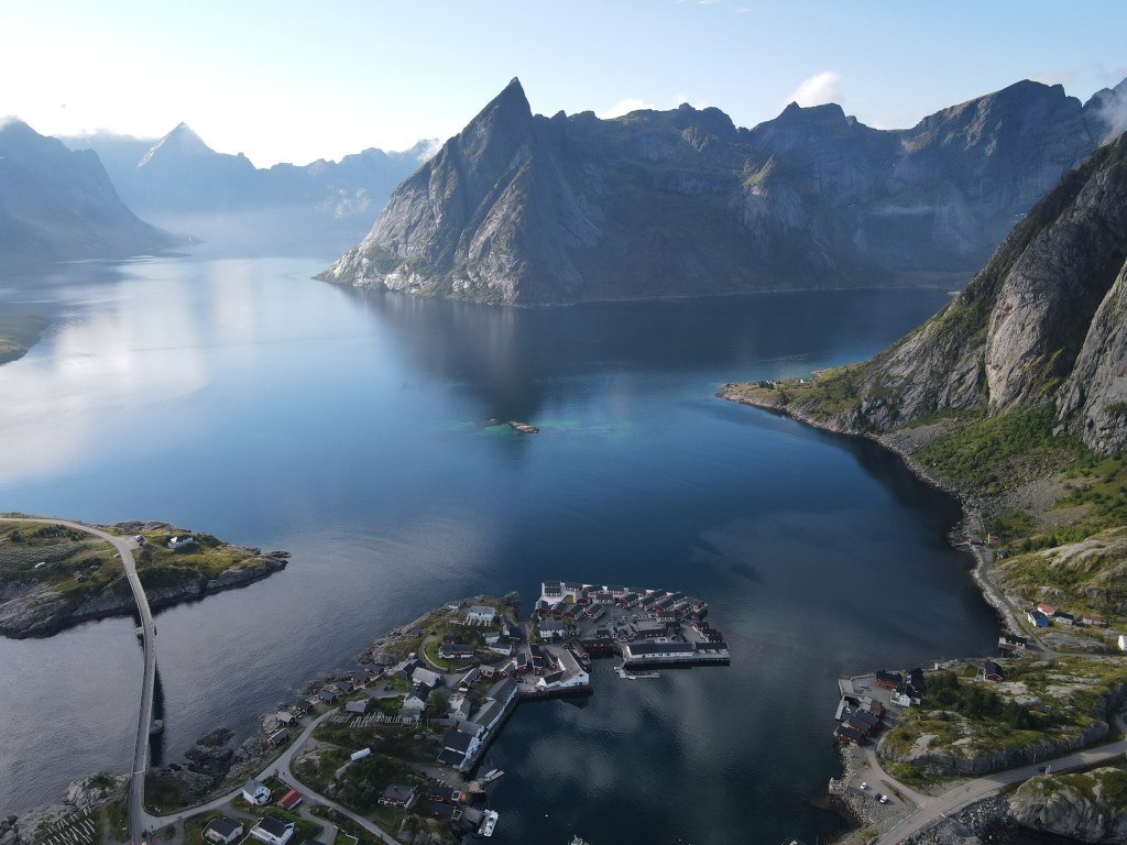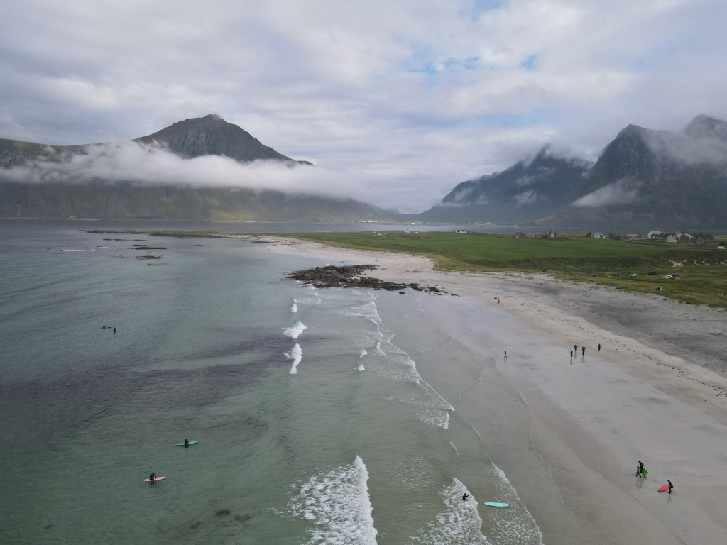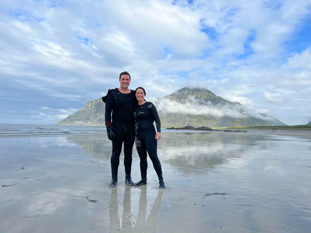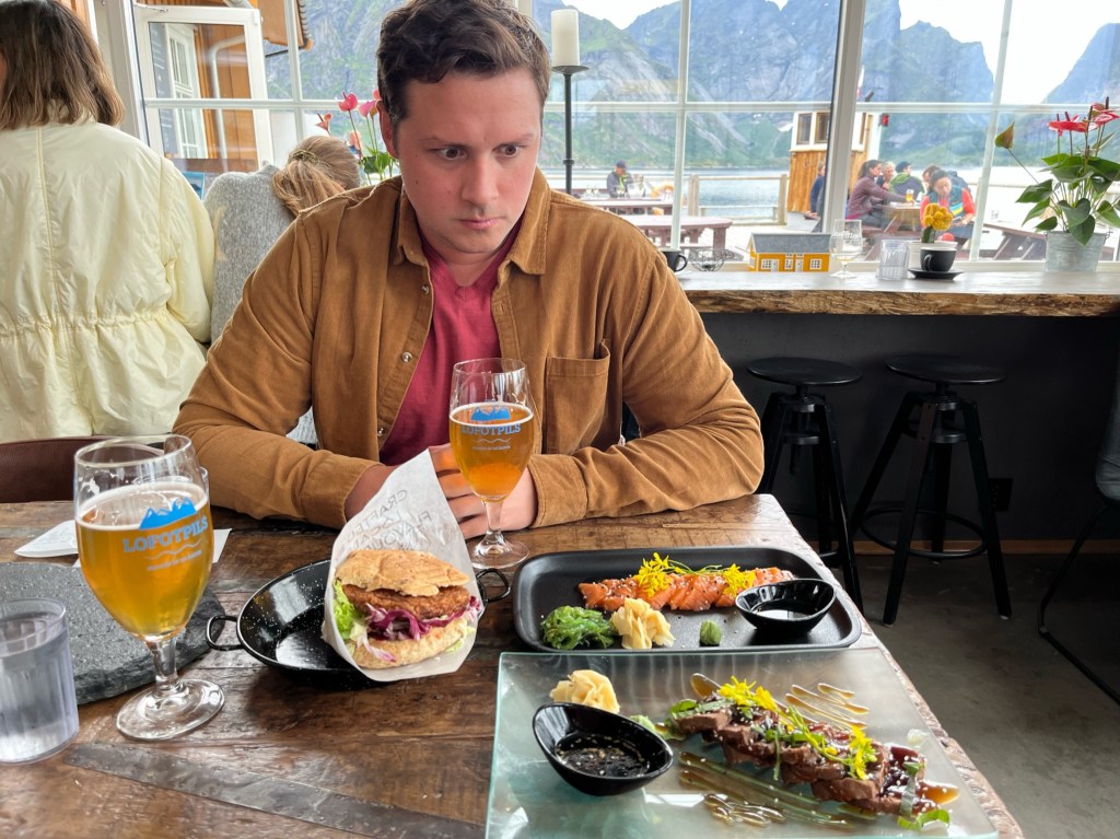 Our AirBnB was nestled in a fishing village called Hamnøy (Population: 42) that overlooked the bright blue water of the Reinefjord, and was across the street from the Arctic Ocean. We spent our first days taking drives to scenic spots, sampling the local specialities at the only restaurants within 2 hours, and taking some grueling but unforgettable hikes. We tried Whale Tataki, Fishburgers, Stockfish, and Salmon Nigiri, and a variety of the local Lofotpils beers. Oh, and we went surfing in the Arctic Ocean next to the northernmost surf shop on earth!